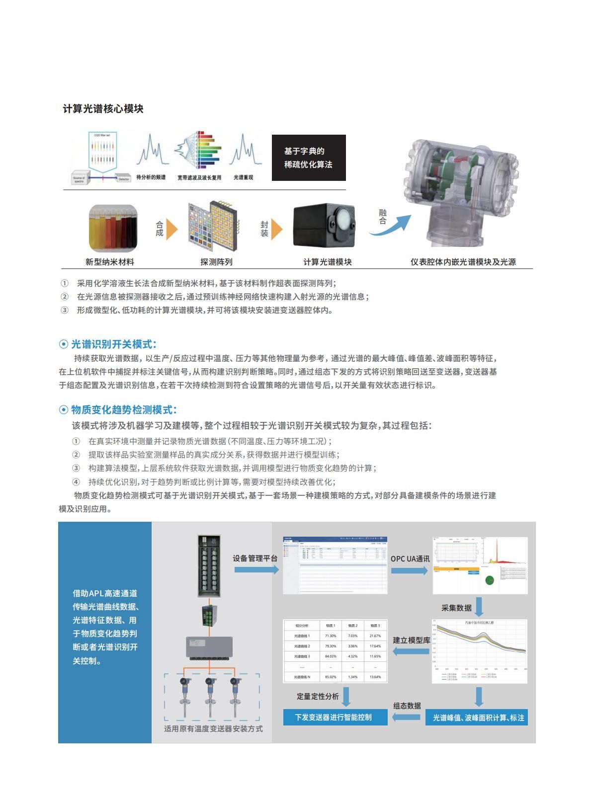 原位光谱检测变送器,是一款以温度变送器为主体结构、融合微型计算光谱的新型变送器, 是基于物质荧光特性的拥有光谱检测能力的创新型现场仪表,可在原先温度测量点位基础上额外感知光谱信息,具有体积小、成本低、响应快等特点。 在化工、制药等领域, 可通过内置激光光源的激发, 实时获取物质荧光光谱数据, 并结合配套工具软件,将光谱信号中所蕴含的信息上送至控制系统及诊断系统。 帮助用户深入理解生产反应过程、优化工艺参数、提升产品质量,最终实现高效、安全、稳定的生产。原位光谱检测变送器支持光谱识别开关、 物质变化趋势检测两种模式, 支持rs485、apl两种通讯方式,并结合上层管理软件,实现光谱数据获取、关键谱点信息标注、 识别策略注入、 成分识别算法学习及构建等。